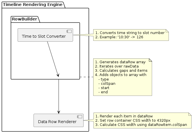 UML Editor Content @startuml package "Timeline Rendering Engine" { package "RowBuilder" { [Time to Slot Converter] --> [RowBuilder] } [RowBuilder] --> [Data Row Renderer] } note right of [Time to Slot Converter] 1. Converts time string to slot number 2. Example: '10:30' -> 126 end note note right of [RowBuilder] 1. Generates dataRow array 2. Iterates over rawData 3. Calculates gaps and items 4. Adds objects to array with - type - colSpan - start - end end note note right of [Data Row Renderer] 1. Render each item in dataRow 2. Set row container CSS width to 4320px 3. Calculate CSS width using dataRowItem.colSpan end note @enduml